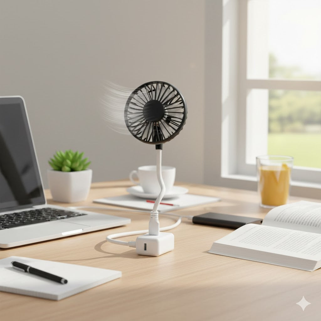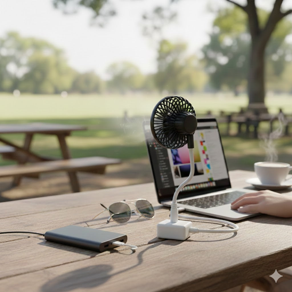 The compact size makes this fan easy to carry and store without taking up space. Its flexible hose allows 360-degree angle adjustment, so you can direct airflow exactly where you need it. Whether placed on a desk, bedside, or used on the go, it adapts easily to different situations. This design offers freedom and convenience for travel, outdoor use, or everyday comfort.